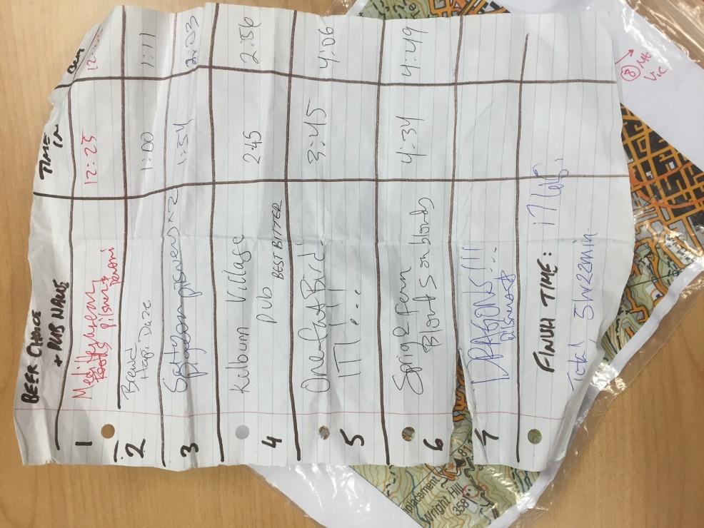 My teammate Scott and I were hearing this a lot. It was the first thing we were told at each checkpoint, in this case one of seven pubs somewhere across Wellington. No jelly babies or Lucozade on offer here, just the distilled goodness of acres of barley. This was the inaugural Hops and Hills race around New Zealand’s capital. Set up by Carnethy exile Tom Middlemiss to recreate a race round Edinburgh, it involves a loop round seven summits around Wellington in teams of two. No course, just trails, seven summits and seven pints in seven different pubs. As the crow flies its about 18km, but as we all know, crows tend to go point to point and don’t lurch all over the sky trying to find a boozer between each cloud. We even got an orienteering style sheet to mark down all the checkpoints, beer choice and “transition” times.