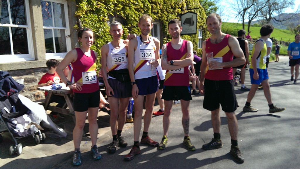 There was a lot of head scratching going on at the Craven Arms pub in Appletreewick, scene of the third Charlesworth Chase race on May 17th. For anyone who’d turned out at Jack Bloor, Coniston or the relay, it was the longest stretch of races in sunny weather since 1907. Or something like that. The event was set up in 2012 by Sarah and Nick Charlesworth on their wedding day as a sort of fell race meets It’s a Knockout meets the Wicker Man, with Sarah running up Simon’s Seat in a wedding dress being pursued by a lot of sweaty runners, including her husband to be. As an added twist, all finishers are required to sink a pint of ale outside the pub before staggering the last few metres to the finish. Marshals are on hand to penalise any unlawful spillage.