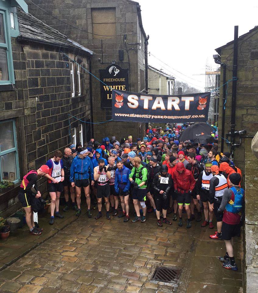 In a wonderful touch the Rev’d Howard Pask, vicar of Heptonstall addresses us and reassures us that Jesus will sustain us on our way round the course (and indeed he does! But more on that later…). A blast on an air horn and we’re off up the wet cobbles to the cheers of spectators.