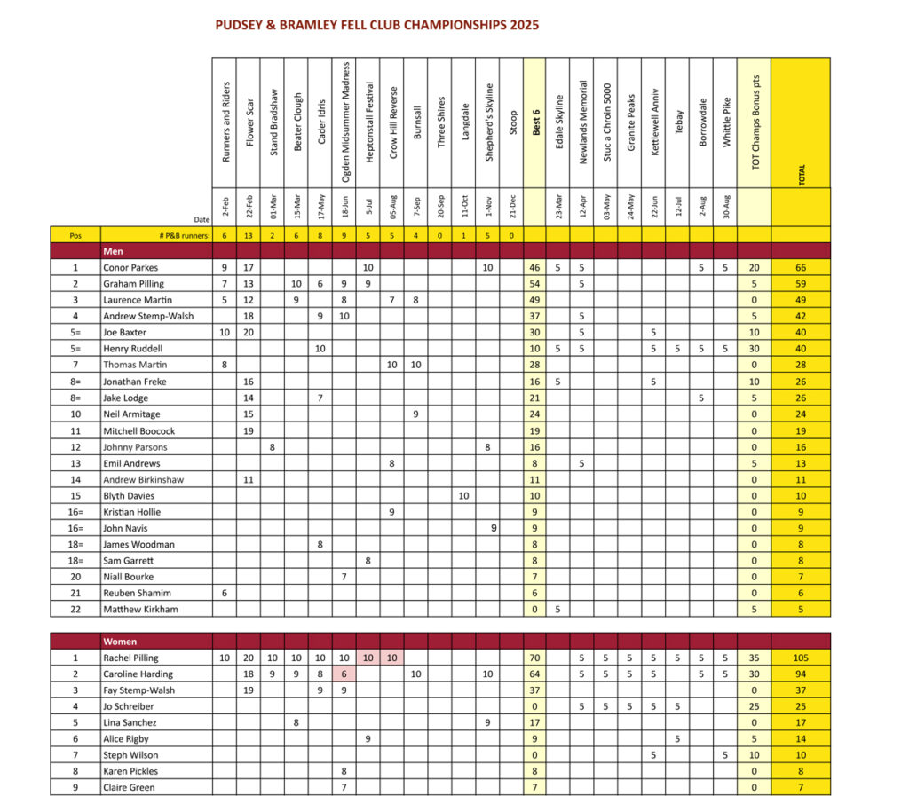 Example points: Heptonstall – 12 male & 8 female P&B finishers = 20 finishers. Fastest male gets 20 points, fastest female gets 20 points, 5th fastest male gets 15 points, 5th fastest female gets 15 points.