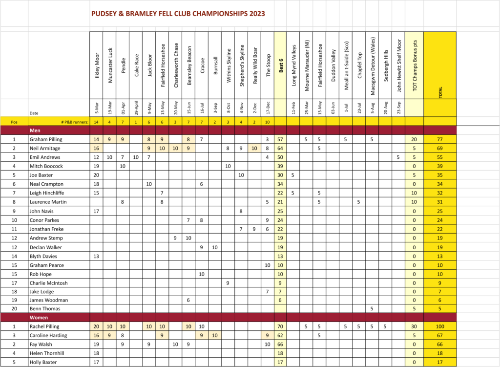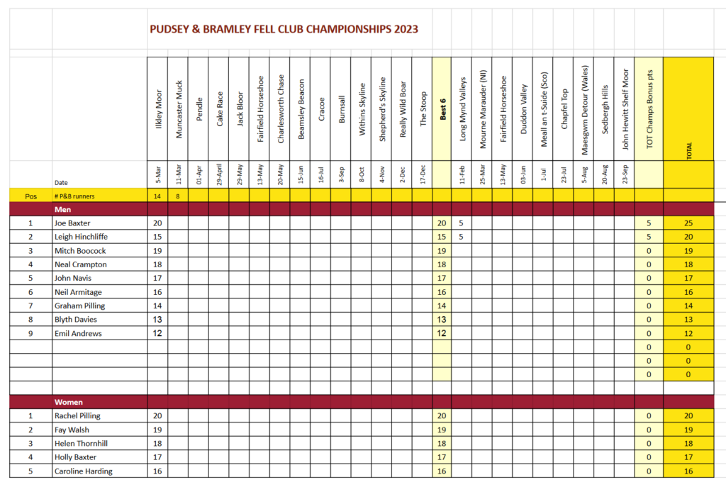 - BONUS CHAMPS POINTS – all runners will get a bonus 5 pts for every English and British Fell Championship race they finish (i.e. 45pts available as 6 English, plus 4 British (one of which is a combined English and British).